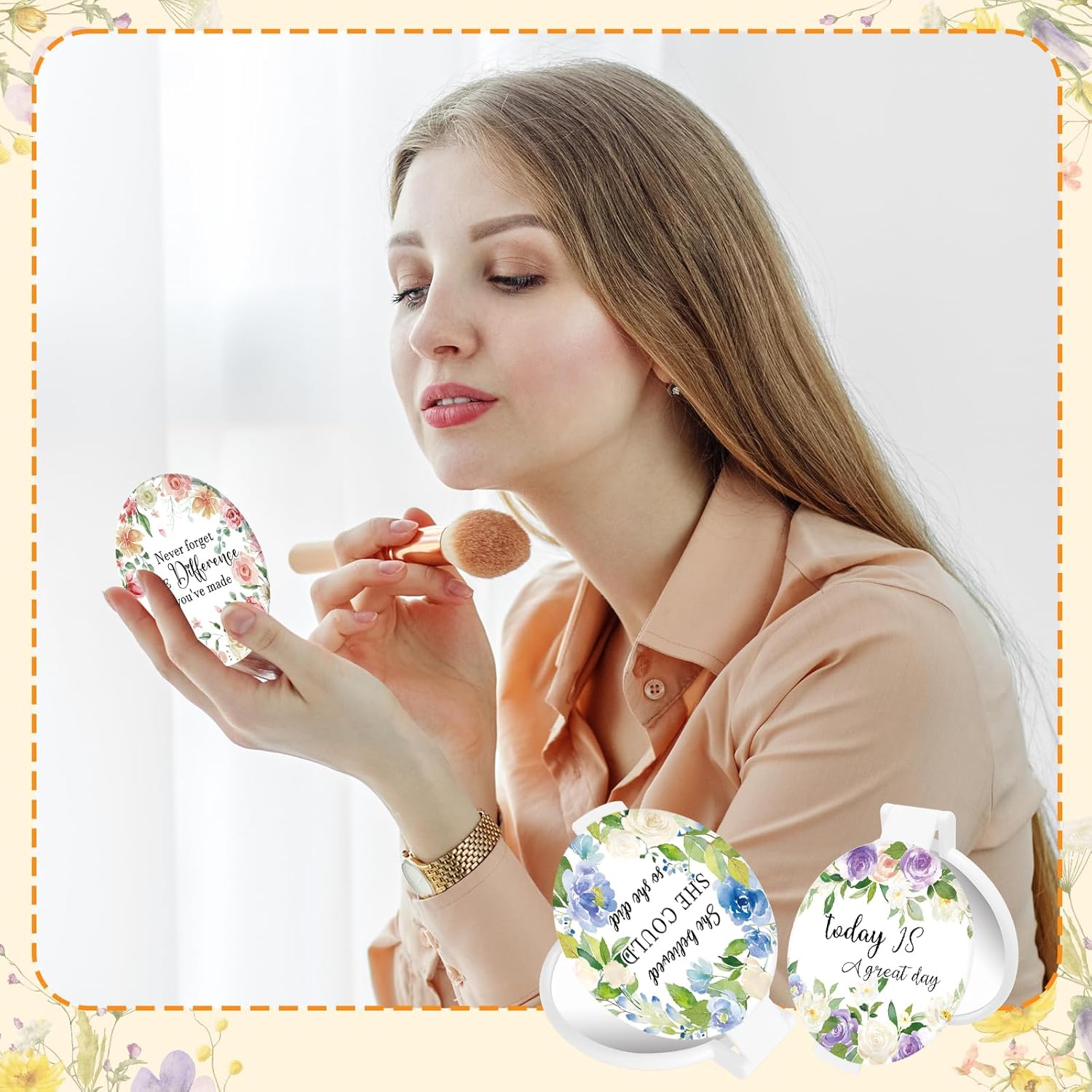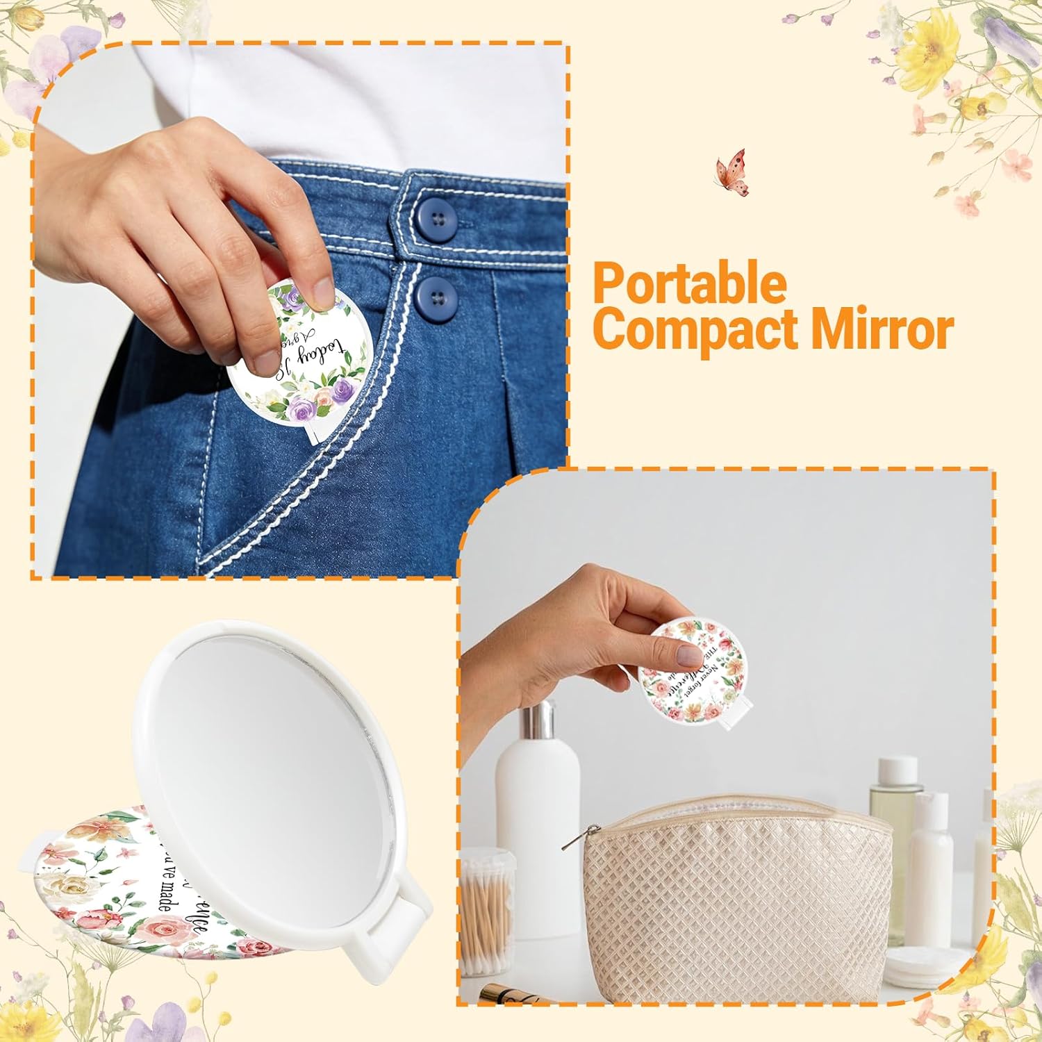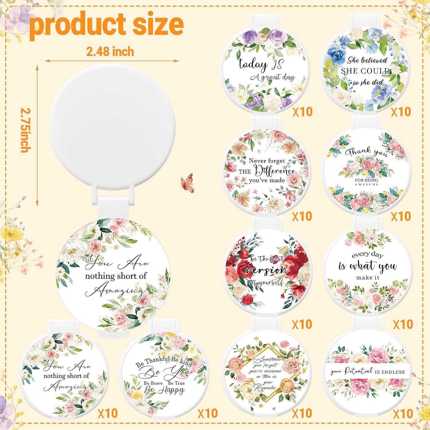 Abundant quantity:These 100 inspiring mirrors are sufficient to be given as gifts to friends around you to inspire them.As a gift:These beautiful flower-themed small mirrors are an ideal choice for giving as gifts to women. They can also be given as gifts on occasions such as Mother's Day, Nurse's Day, birthday, anniversary, and graduation ceremonies.Features:Specifications:Material: plastic and glassColor: whiteSize: about 2.48 x 2.75 inchesPackage includes:100 x Inspirational mirrorNotes:Manual measurement, please allow slight errors on size.The color may exist a slight difference due to different screen displays.