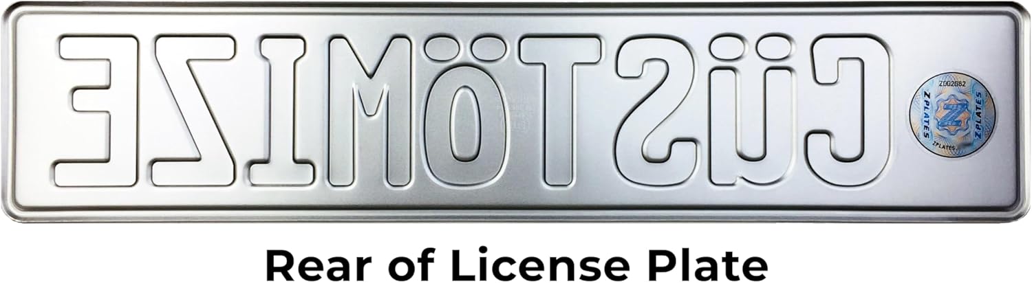 Custom Novelty European License Plate Features: ★ Aluminum plate ★ Embossed on a 35-ton German machine ★ Hot-stamped ink ★ White reflective background Custom Plate Specifications Dimensions: 20.5 x 4.33 inches | 520 x 110 mm Up to 10 characters and spaces Aluminum license plate blank Available Characters: See image for available characters and keyboard map for special characters Ink Color: See listing images for ink color options "Weatherproof" inks can be displayed indoors or outdoors "Indoor Only" inks may fade if displayed outdoors The plate preview will show black ink color, your ink color selection will show in top right corner of preview. Optional Standard or Premium Frame: Dimesnions: 20.75 x 5.13 inches 2 screws included Step-by-step installation guide included Premium Frame Option: has 4 rubber pads to prevent/reduce rattling and scuffing Recommended for the best display and most secure installation of your custom plate Optional Versa-Fit Brackets: Dimensions (each): 4.65 x 2.56 inches 2 brackets (1 left and 1 right bracket for 1 plate) 2 screws included Low-profile Recommended for clearance of nearby parking sensors or cameras Optional Plate Holes: Holes are 7 inches apart, center to center 2 screws included Same hole spacing used for standard US plates on US cars Allows you to mount your plate directly without a frame or bracket Optional City / Year Sticker: City sticker has unique serial number, one-of-a-kind 1440 dpi for amazing detail Durable 2.5 mil vinyl Rated for 6+ years outdoors Waterproof Type ≠ for City sticker placement preview Type ≈ for City and Year sticker placement preview You must select City / Year sticker(s) in customization The plate hole option adds 2 upper plate holes spaced 7 inches apart, the same as standard US plates. Remember, this Euro-style plate is much wider at 20.5 inches. Measure yours first to ensure the same spacing. If this option is not selected, your plate will not have any holes. The plate hole option is not needed if you are using one of our mounting frames or brackets. Legal Disclaimer: This product is for decorative or entertainment purposes only and is not a substitute for state-issued license plates or vehicle registration. Buyers are solely responsible for ensuring lawful use. Misuse, including any attempt to defraud or mislead, is strictly prohibited and may result in legal consequences. The seller assumes no liability for improper use. Export to Germany is prohibited.