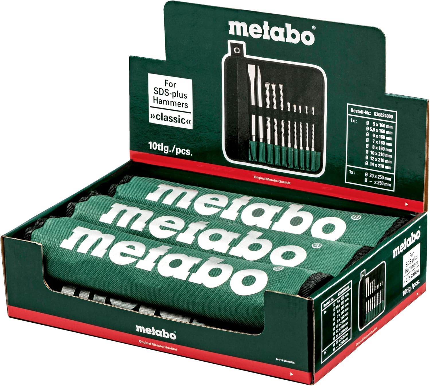Metabo 630824000 Sds-Plus Classic Drill/Chisel Set,10-P.. Day after day, Metabo products prove their efficiency in professional use - in the hardest of conditions - worldwide. Where professionals give their best, they have to be able to rely 100% on a partner, even more, they have to trust that partner. Therefore "when it matters" is the core thought of our new international brand appearance.