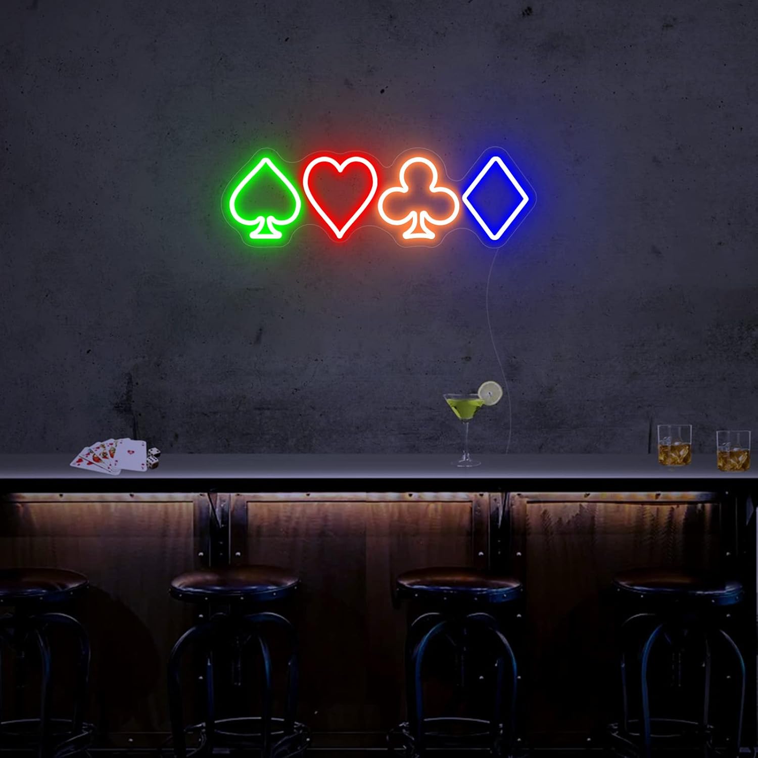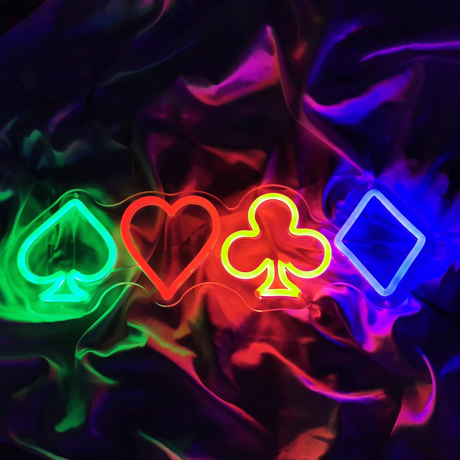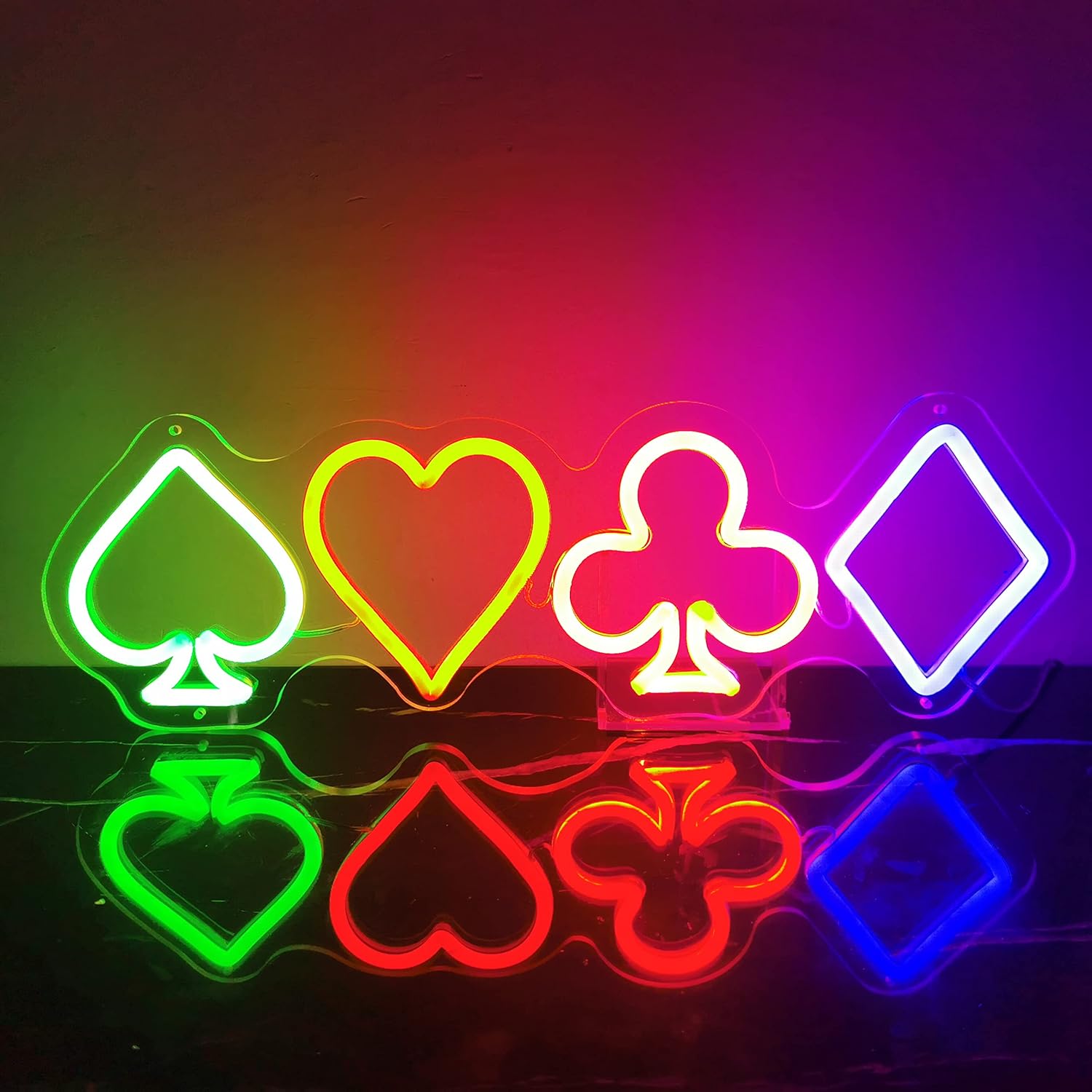 Led playing cards neon signs bring you a brand new visual experience on your poker room! Perfect decoration and unique gift for poker room, bedroom, game room, home bar, parties and other celebration occasions.An unique gift can make the simple life more lively and interesting. The enthusiastic atmosphere created by neon wall decor sign makes it destined to be the perfect choice for gift giving. The 4 poker symbol neon light is a handmade artwork gift for family, friends, teens, poker lovers for birthdays and holidays. Use it to create a friendly or even romantic atmosphere around your bedroom, poker room, game room or man cave.