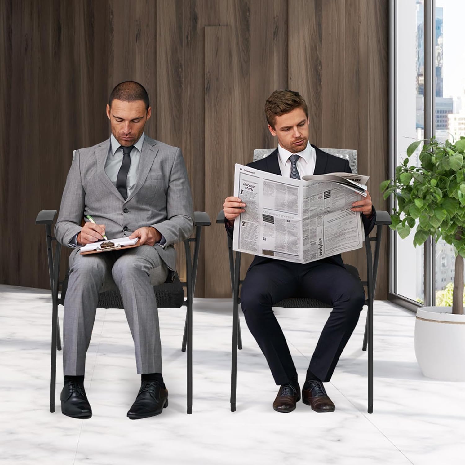 Specifications Color: Grey Material: Steel, Plastic, Mesh Cloth, Sponge Number of Items: 2 Process: Plastic Spray Each Load Bearing Capacity: 220kg/485lbs Assembly Required: Yes Folded Chair Size: 50*24*83cm/19.69*9.45*32.68inch Unfolded Chair Size: 50*53*83cm/19.69*20.87*32.68inch Cushion Size: 45*45cm/17.72*17.72inch Height of Cushion to the Ground: 45cm/17.72inch Packaging Size: 88*58*24cm/34.65*22.83*9.45inch Gross Weight: 15kg/33lbs Package Included 2*Office Reception Guest Chairs All Accessories for Assembly